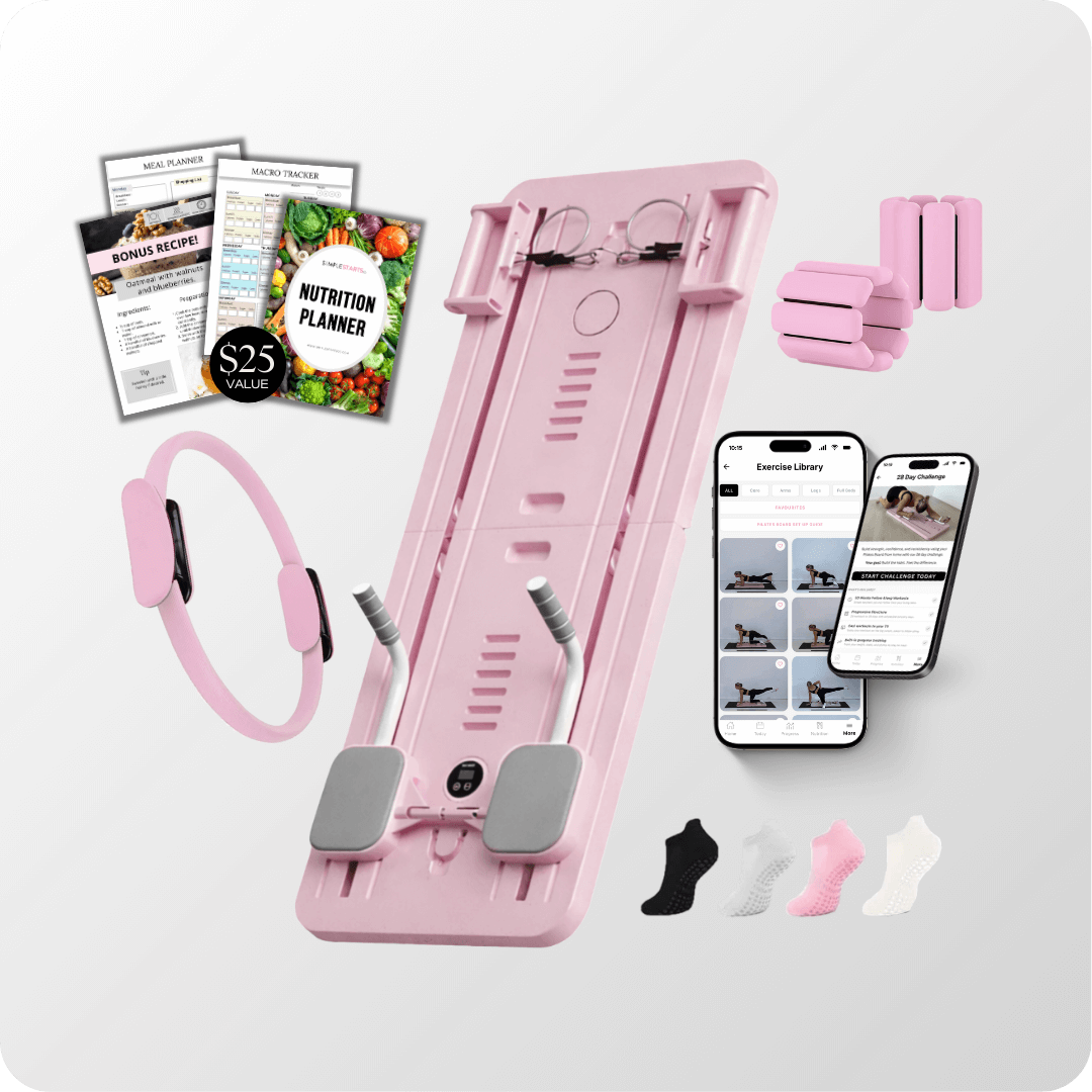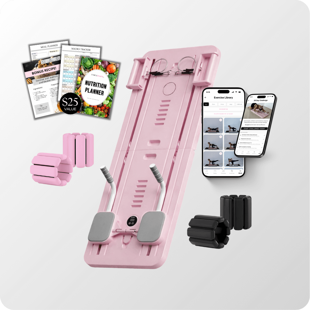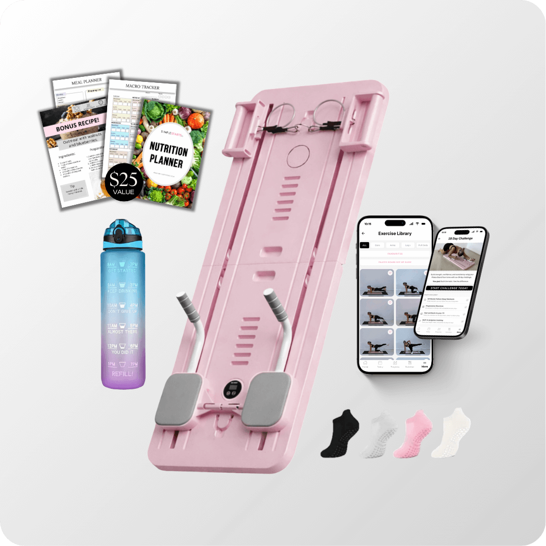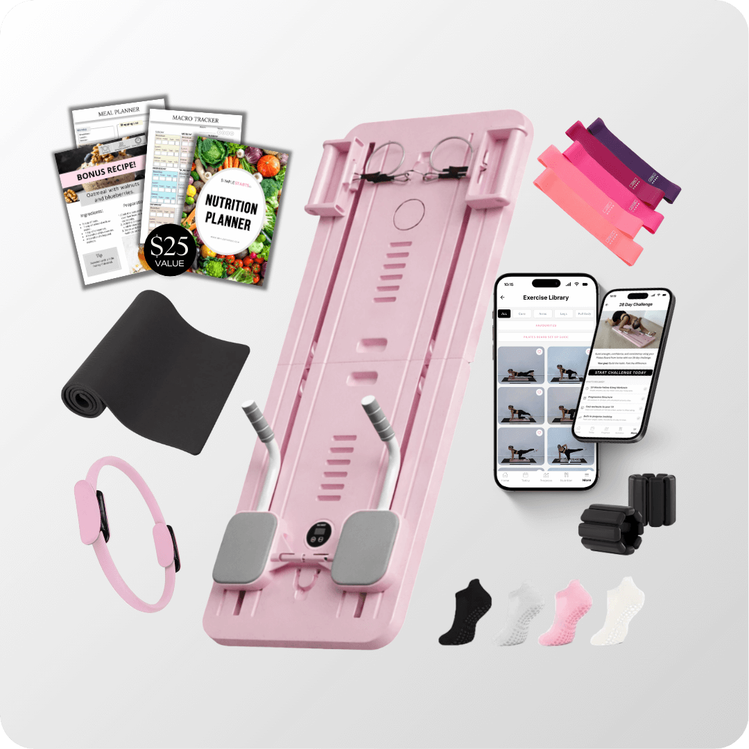 In addition to the Simple Starts Pilates Board, you will receive 2x resistance bands (with handles), 1x timer, 1x phone holder and 1x kneeling pad.