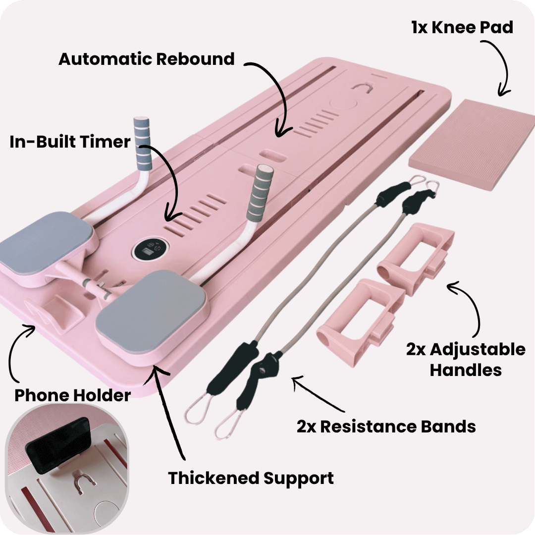 Of course your new stunning Pilates Board, all the accessories, ready to go when you are! Sets up in seconds, so you can skip the hassle and jump straight into owning your workout.