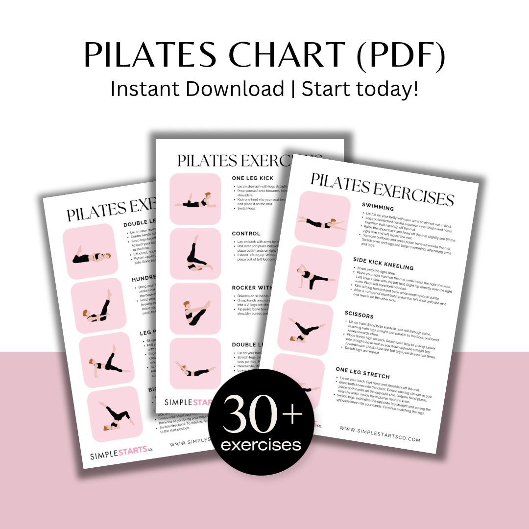 30+ Basic Pilates exercises that you can follow from home, with no equipment, starting today! The chart includes images, descriptions and exercise instructions.